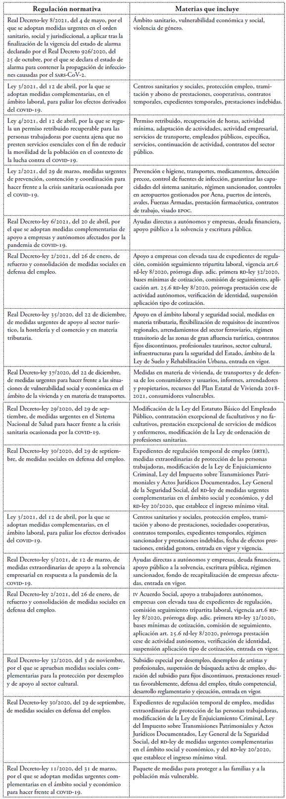 La respuesta a nivel político que gestiona el Gobierno español hace hincapié en la consecución de dos objetivos a corto plazo: 1) proteger la salud, 2) apoyar a la economía. En relación con ello, exponemos en la siguiente tabla la principal regulación normativa en materia social, sanitaria y de empleo.