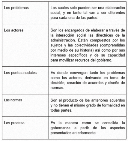 Como se detalló en el marco teórico, la gobernanza debe estar compuesta por una serie de elementos en constante construcción y debate colectivo: los problemas, los actores, los puntos nodales, las normas y los procesos. Estos elementos fueron propuestos a partir de algunas experiencias sobre procesos de descentralización y participación ciudadana de países de América Latina (Montoya-Domínguez y Rojas-Robles 2016).