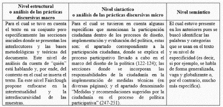 A partir de las anteriores consideraciones, se analizó el PDDAB desde dos categorías-conceptos: desarrollo sostenible y gobernanza ambiental. El documento fue estudiado en su totalidad, pero se hizo énfasis en determinadas secciones, de acuerdo con la selección del corpus discursivo y el corpus complementario. Dicha selección de muestras estuvo determinada por el nivel de análisis del discurso, el cual está dividido en tres, según las clasificaciones propuestas por Van Dijk (2017) y Fairclough (1992):