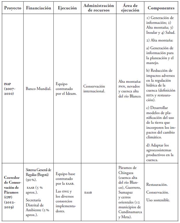 Si bien es posible afirmar que la naturaleza del ensamblaje para la operación del sistema Chingaza se mantiene a través del tiempo gracias a un conjunto de prácticas de la EAAB y del Parque Nacional Natural Chingaza (en adelante PNN Chingaza), se analizan aquí dos proyectos que pretenden enfocarse en la población local más allá de los objetivos de conservación y de la provisión de agua para Bogotá. Los proyectos analizados son Integrated National Adaptation Plan (en adelante INAP), más conocido en Colombia como el proyecto piloto de adaptación al cambio climático, financiado por el Banco Mundial, gestionado por Conservación Internacional (en adelante CI) e implementado por el Instituto de Hidrología, Meteorología y Estudios Ambientales (Ideam), el cual tuvo cuatro componentes: insular, generación de información, salud y alta montaña, desarrollándose este último en la cuenca alta del río Blanco, en los municipios de La Calera y Choachí y el proyecto del Corredor de Conservación de Páramos (en adelante CPP) cuya principal fuente de financiación consistió en el Sistema General de Regalías del Distrito Capital y ejecutado por la EAAB para la conservación y el uso sostenible de un conjunto de páramos circundantes a Bogotá (ver tabla i). Aunque aparentemente la injerencia de la EAAB en el proyecto INAP no fue tanta como en el proyecto CPP, se examinará información que muestra su importante influencia en el diseño y la implementación de ambos proyectos.