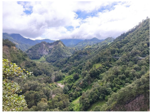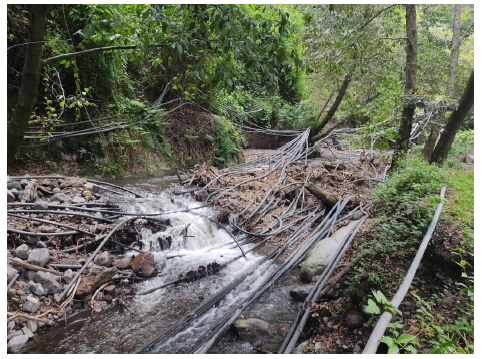 Figura 3: La zona de Amatzinac vista desde el puente de los comuneros y ejidatarios. Se pueden apreciar varias mangueras colocadas en las alturas