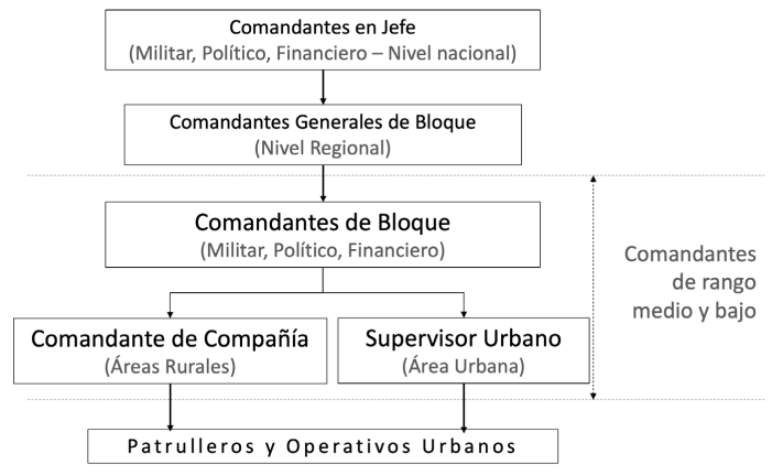 La presente investigación dirigió su atención a los excomandantes de rangos medio y bajo del Bloque Sur Putumayo (BSP) en razón a su reducida representatividad frente a la estructura más amplia de las AUC (Figura 2). Además de su baja posición en la jerarquía de mando, los intereses de esta confederación paramilitar se concentraron principalmente en las regiones central, norte y occidental de Colombia, (Ronderos 2014, GMH/CNMH 2018b) mientras que el bloque en cuestión operó al sur del país en un relativo aislamiento respecto a su comando central (GMH/CNMH 2012a) -o, como reiteraron con frecuencia los excomandantes que entrevisté, eran “mandados a control remoto”.